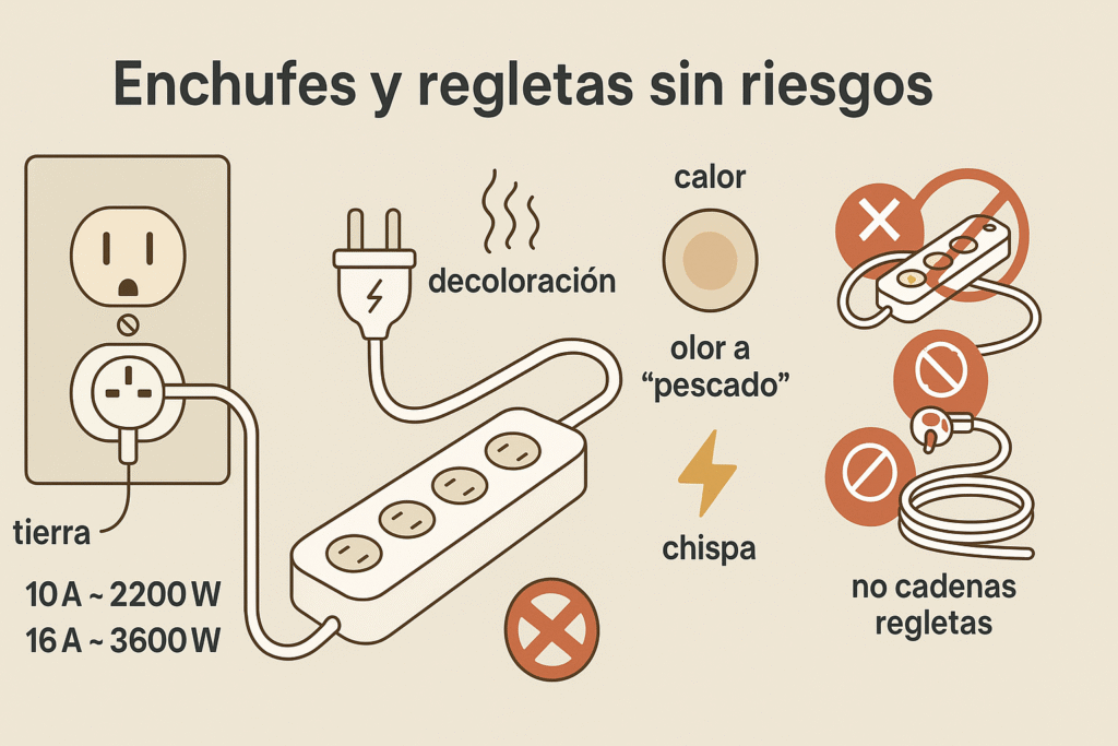 - Si el enchufe no agarra firme (holgura) o la ficha “baila”, cámbialo: contacto flojo = más calor.